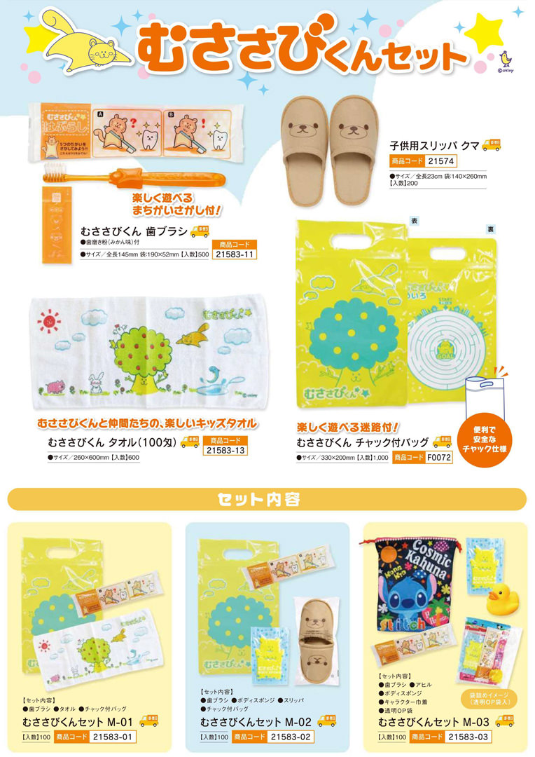 歯ブラシ、タオル、スポンジそれらを入れる袋まで、お子様用に可愛くデザインしております。